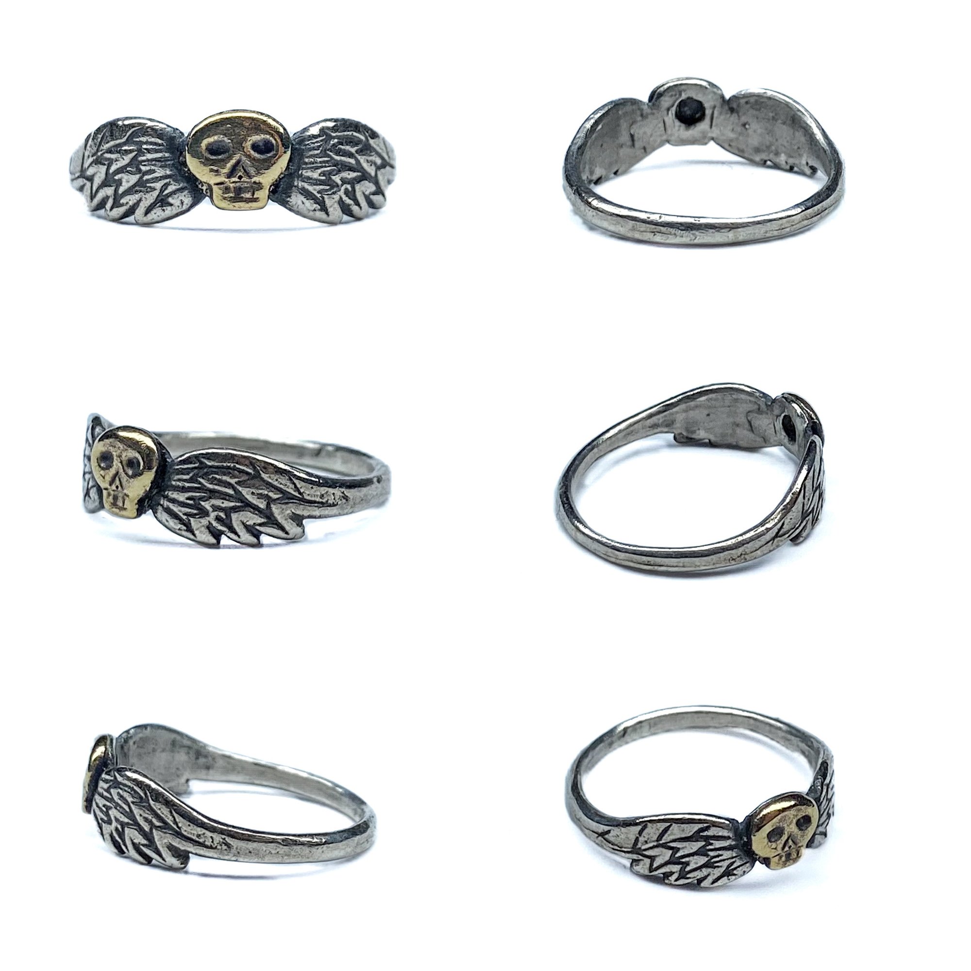 A smaller version of the Taphophile ring. The wings and band are solid sterling silver and the skull is 10k gold.
