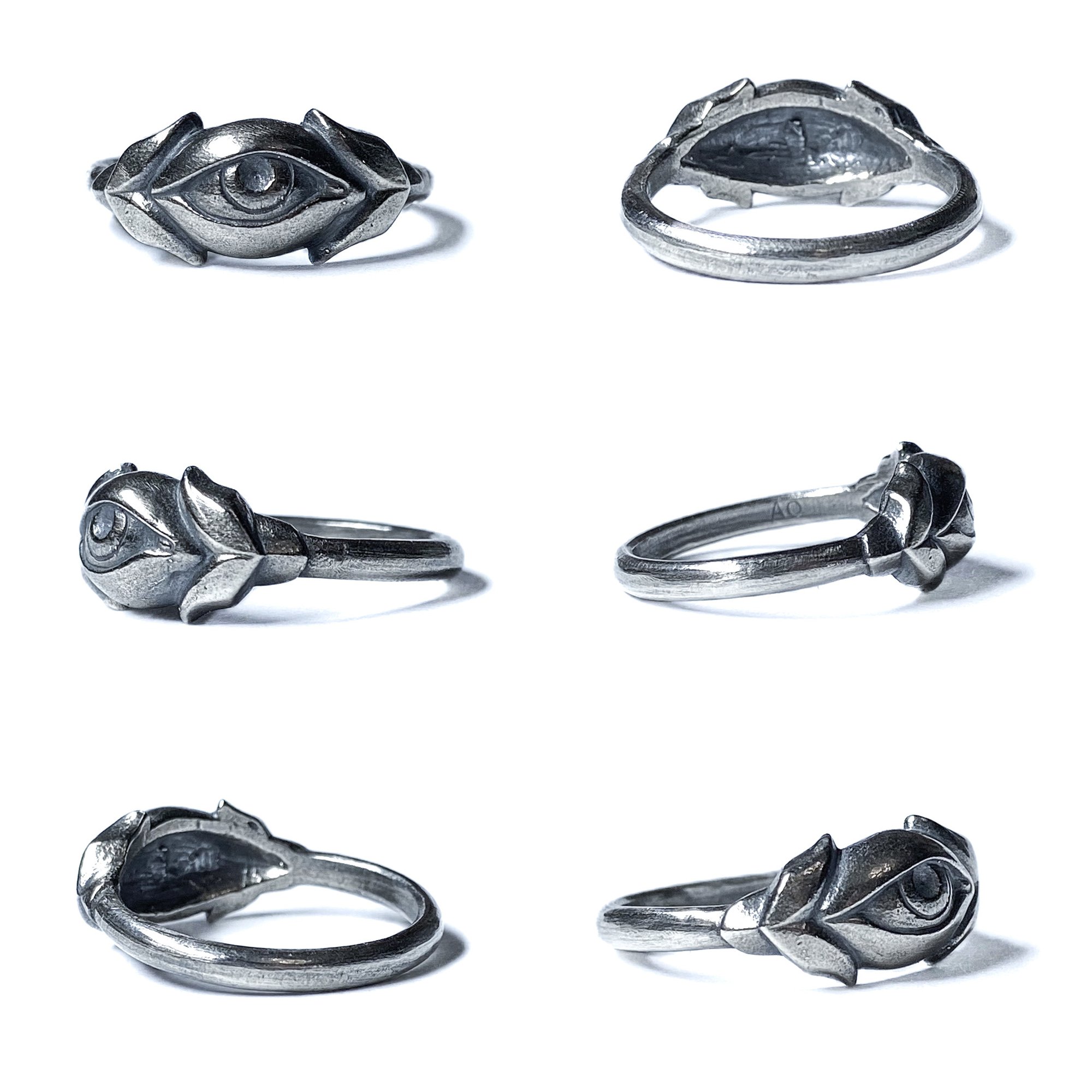 A three dimensional eye flanked by stylized leaves on a rounded band. Cast in your choice of sterling silver, 10k gold, or 14k rose, yellow, or white gold.